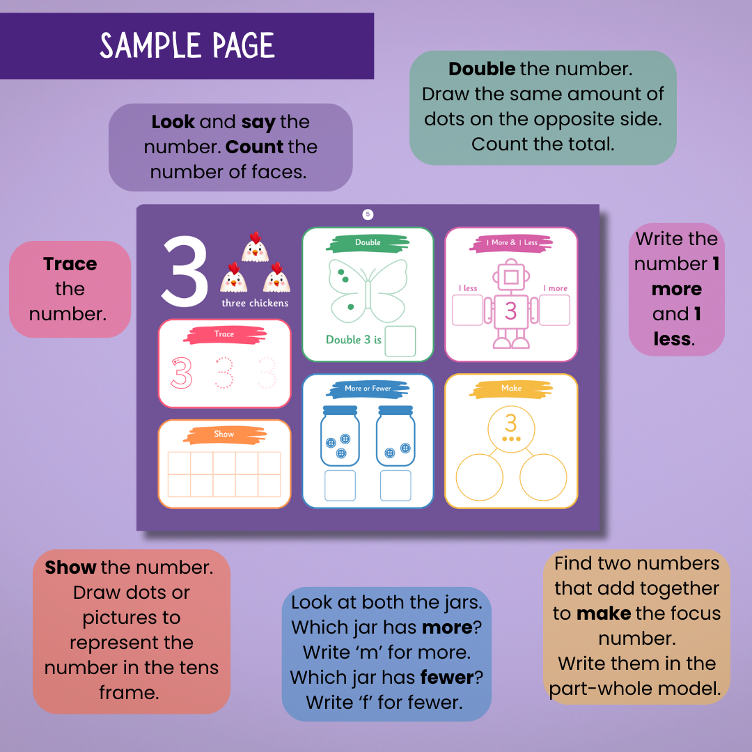 - Numbers 1-10 - one page dedicated to each number. Children will develop a variety of skills to deepen their knowledge of each number including use of a tens frame, doubling, one more/less and composition (part/whole model).