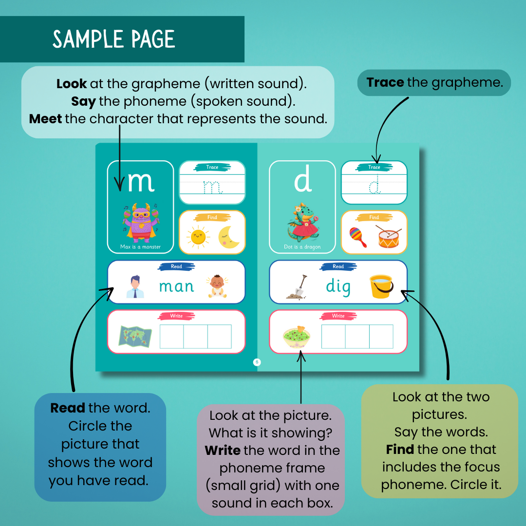 Children will learn single letter sounds as well as diagraphs (2 letter sounds) and trigraphs (3 letter sounds). They will meet a fun character that represents the sound, trace the sound, find the sound, read the sound and write the sound.